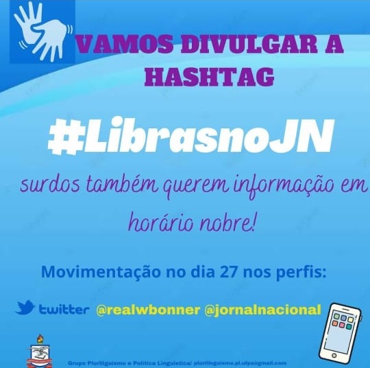 Pensando nisso, o Grupo Plurilinguismo e Política Linguística composto por alunos da UFPA, está lançando um campanha de mobilização que busca levantar a hashtag #LibrasNoJN para atender uma demanda por informação de qualidade no horário nobre para aqueles que compreendem a língua de sinais.