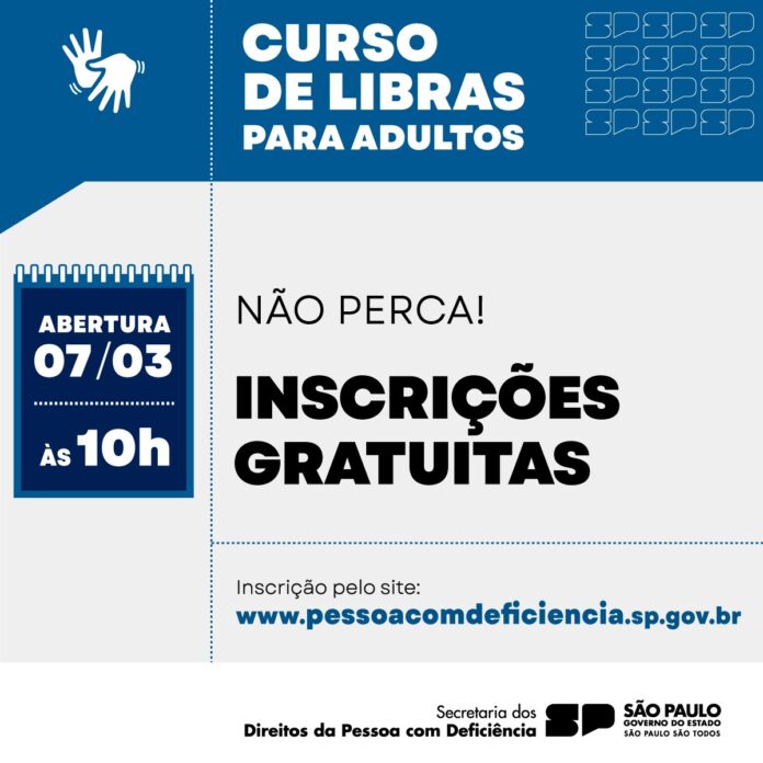 Visando ampliar a inclusão das pessoas surdas no Estado, o Governo de São Paulo, por meio da Secretaria de Estado dos Direitos da Pessoa com Deficiência (SEDPcD), dobrou de 400 para 840 o número de vagas mensais para o curso online básico de Libras, a Língua Brasileira de Sinais, voltado a adultos. As inscrições para as turma de março serão abertas nesta quinta-feira (7), às 10h, no site da pasta estadual.