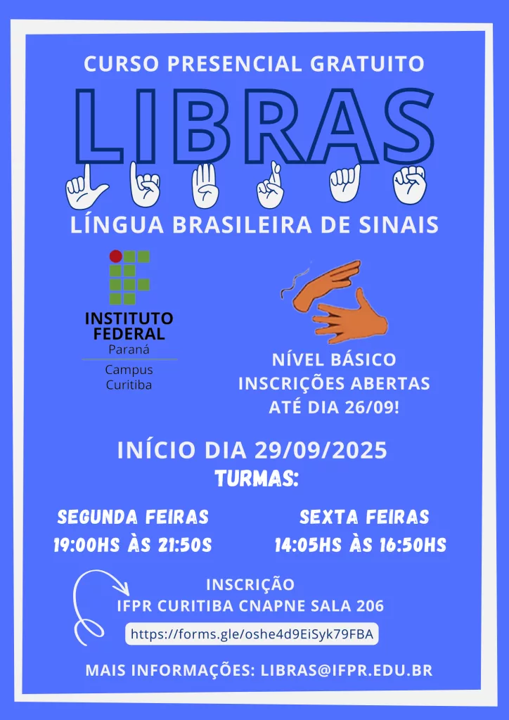 O Núcleo de Apoio a Pessoas com Necessidades Específicas (NAPNE) do Campus Curitiba do Instituto Federal do Paraná (IFPR) ofertará curso gratuito de Libras (Língua Brasileira de Sinais). A iniciativa é voltada para a comunidade interna (servidores e estudantes) e comunidade externa.