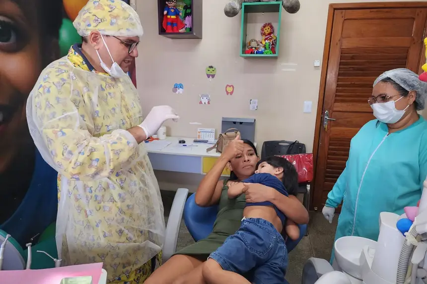 Samara Vieira levou Samuel para cuidar da saúde bucal; iniciativa do Governo do Amapá tem reduzido barreiras históricas ao garantir intérpretes de Libras.