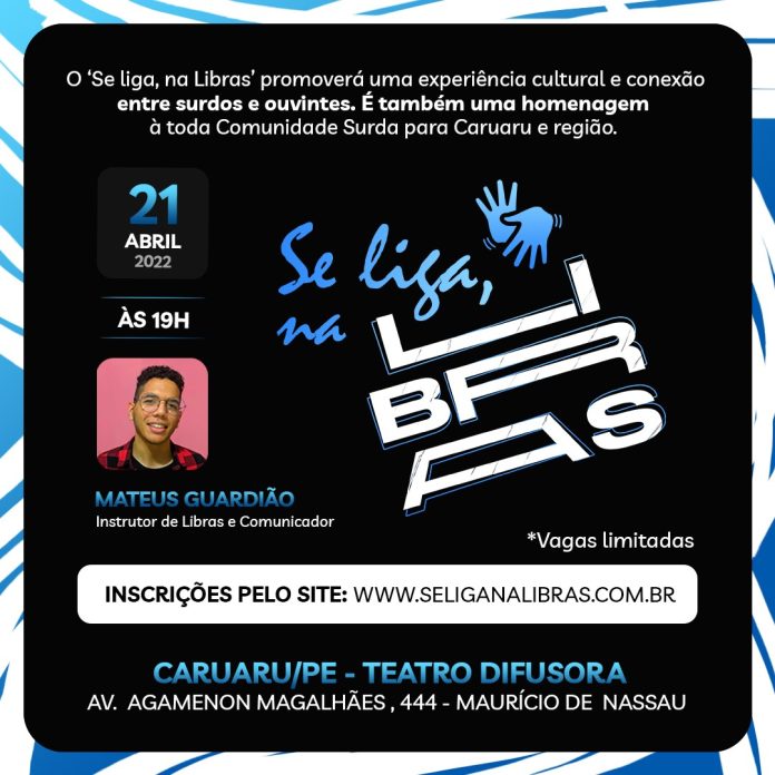 Estão abertas as inscrições a partir desta sexta-feira (01) para participar da 1ª Edição do evento ‘Se liga, na Libras’, que será realizado no dia 21 de abril de 2022, quinta-feira, às 19h, no auditório do Teatro Difusora em Caruaru, no agreste.