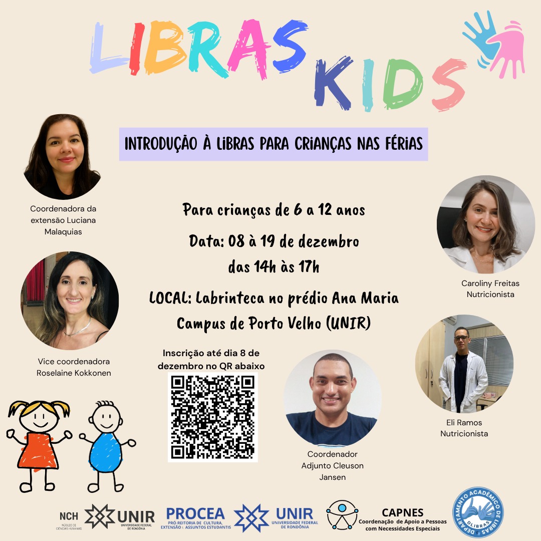 A Universidade Federal de Rondônia (UNIR), por meio da Pró-Reitoria de Cultura, Extensão e Assuntos Estudantis (PROCEA), anuncia a abertura das inscrições para o projeto de extensão Libras Kids, voltado a crianças de 6 a 12 anos.