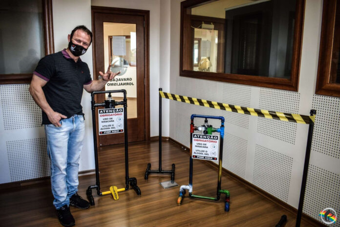 Além do equipamento para adultos, Fernando também desenvolveu um para crianças e ainda criou um suporte que faz as pessoas manterem a distância do balcão de atendimento.